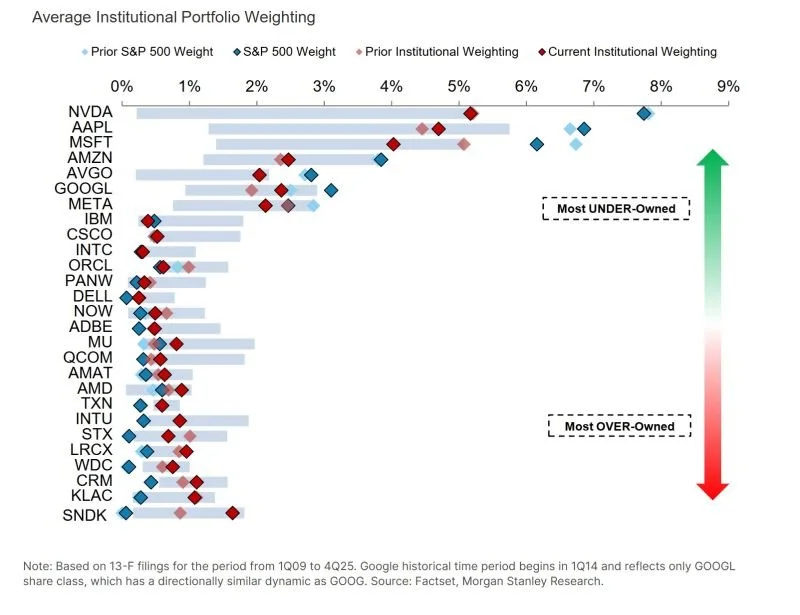 At end-Q4, mega-cap tech stocks were the most under-owned vs. S&P 500 weights in 17 years (Morgan Stanley, 13-F analysis of institutional ownership).